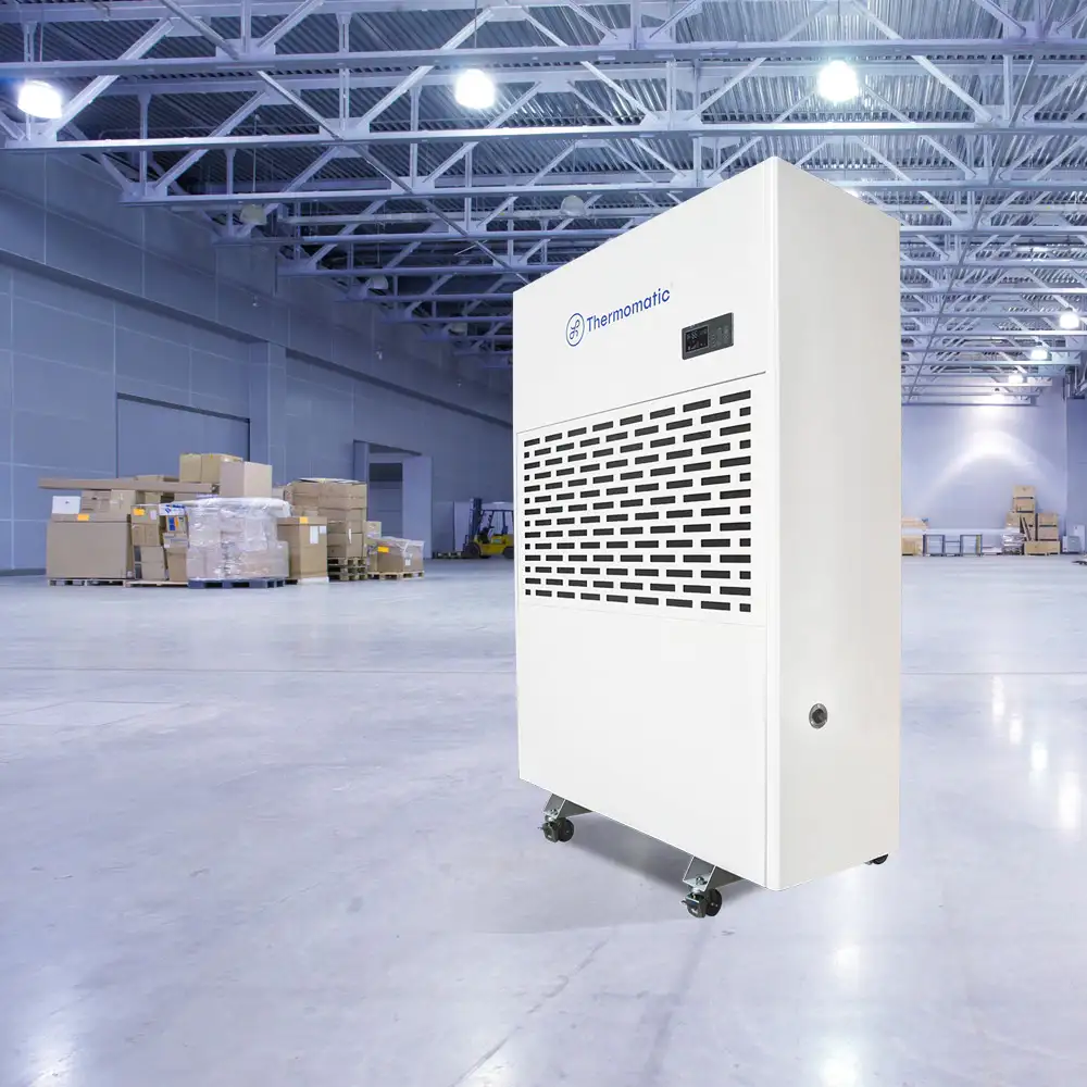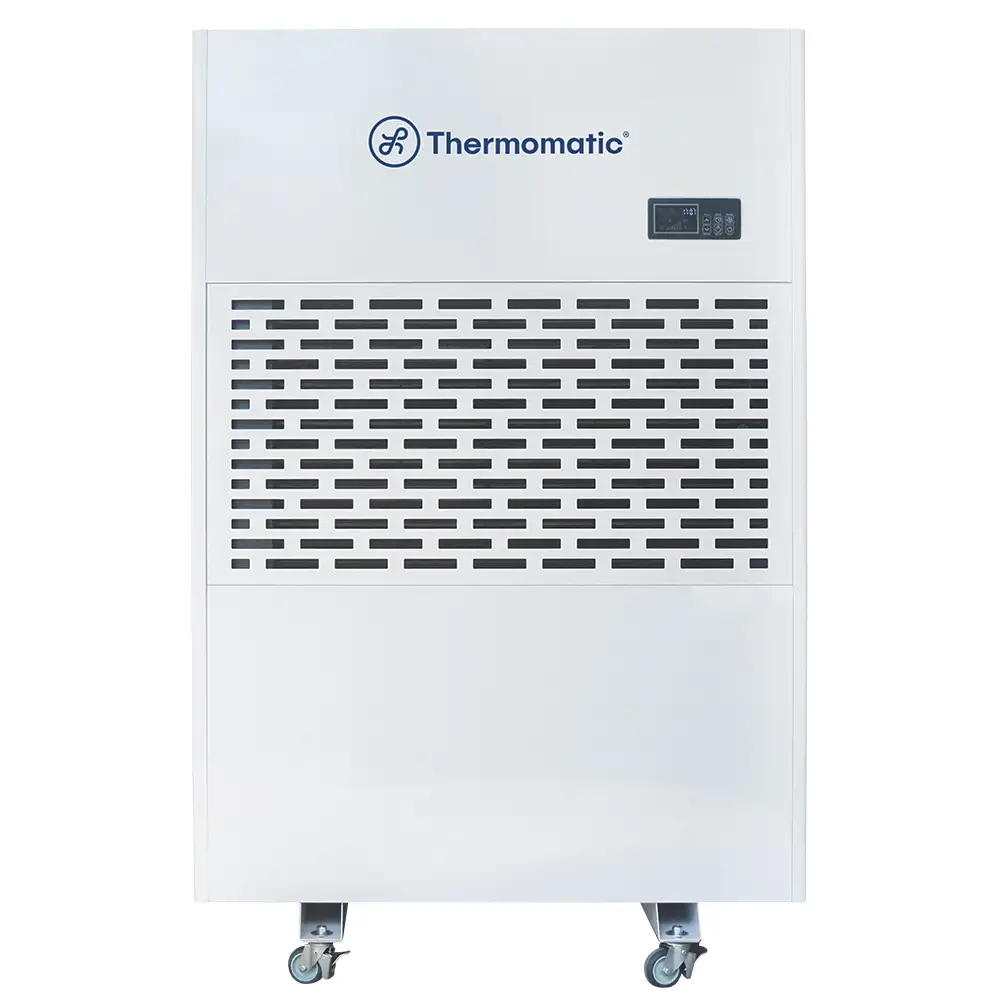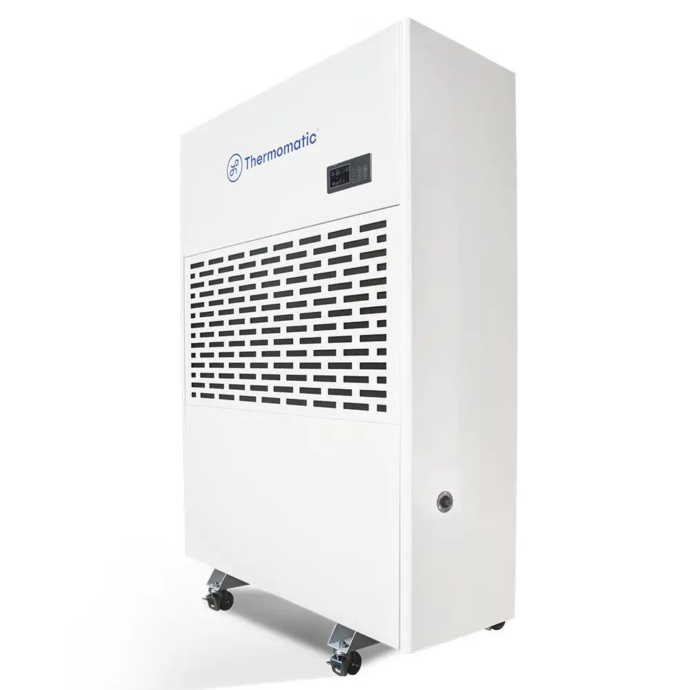 Introducing the PLUS 25.000 industrial dehumidifier - the most powerful of its kind, capable of removing up to 120 gallons of water per day. Its precision humidity control is aided by a high-precision hygrostat, and it features a direct drain for water disposal, defrost function, and an LCD control panel. Ideal for various industries, including laundry, banking, photography studios, and more, it maintains quality standards, controls humidity, and protects materials. Prevents moisture build-up and improves air quality while speeding up drying for painting and predetermined humidity levels.